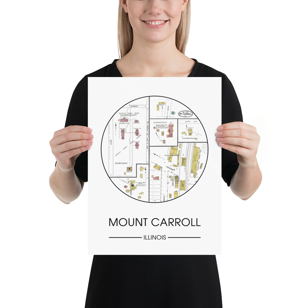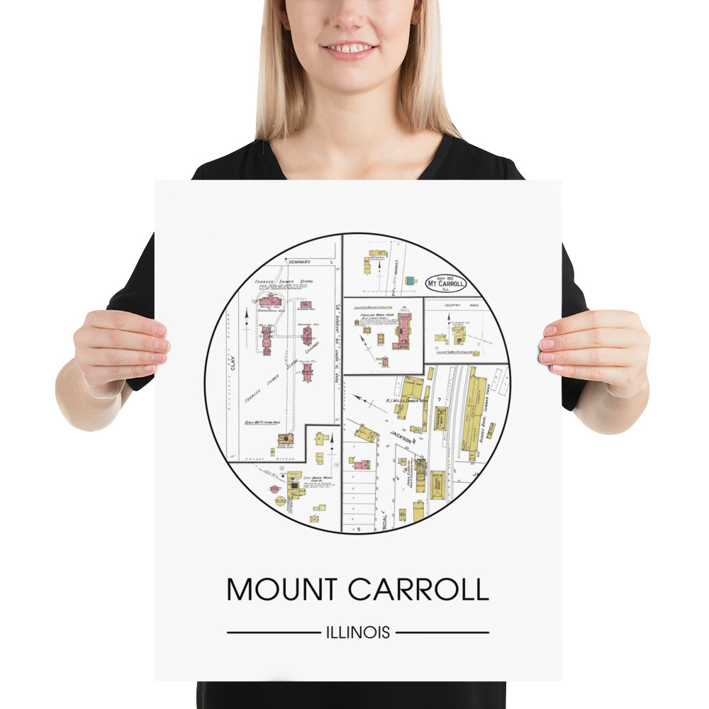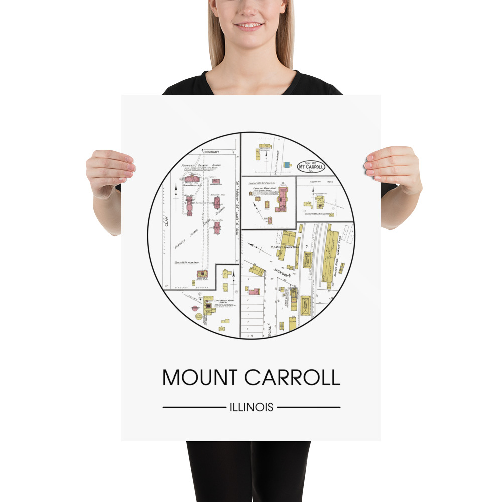 Mount Carroll Map Poster #3 showing several outlying points of interest as they were seen on fire insurance maps from 1912. Notable structures include: The Francis Shimer Academy, Colehour Elevator, The Train Depot and Lumber yards, The Caroline Mark Home, The City Water Works, and The Creamery. Museum-quality posters made on thick and durable matte paper. Add a wonderful accent to your room and office with these puppies that are sure to brighten any environment.